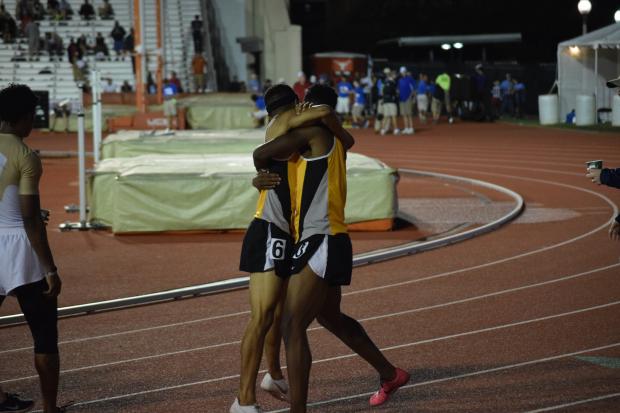 Finishing an unprecedented 1-2 in the 200m, Shamon and Gerald embrace in what was a major moment for the FB Marshall duo. Knowing they would stand on top of the podium together and after falling short two years in a row, had essentially locked up the 5A boys team title.
